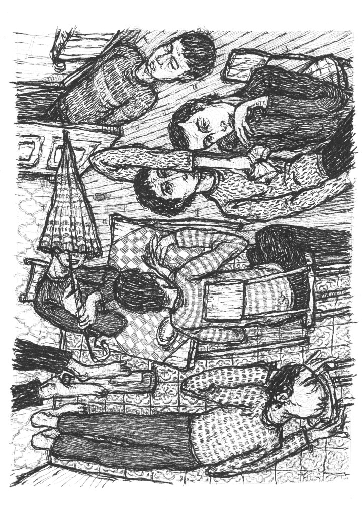 Despite losing large number of artworks, and still through the many stages of displacement he experienced during the war on Gaza, Sohail Salem continues to assert his presence through his drawings, crafted with fine, sharp lines on whatever sketchbook or school notebook paper he can find. These scenes impose themselves on him, compelling him to document them with all the pain and harshness often visible on the faces of his subjects. Yet, these works are not without signs of hope and life.