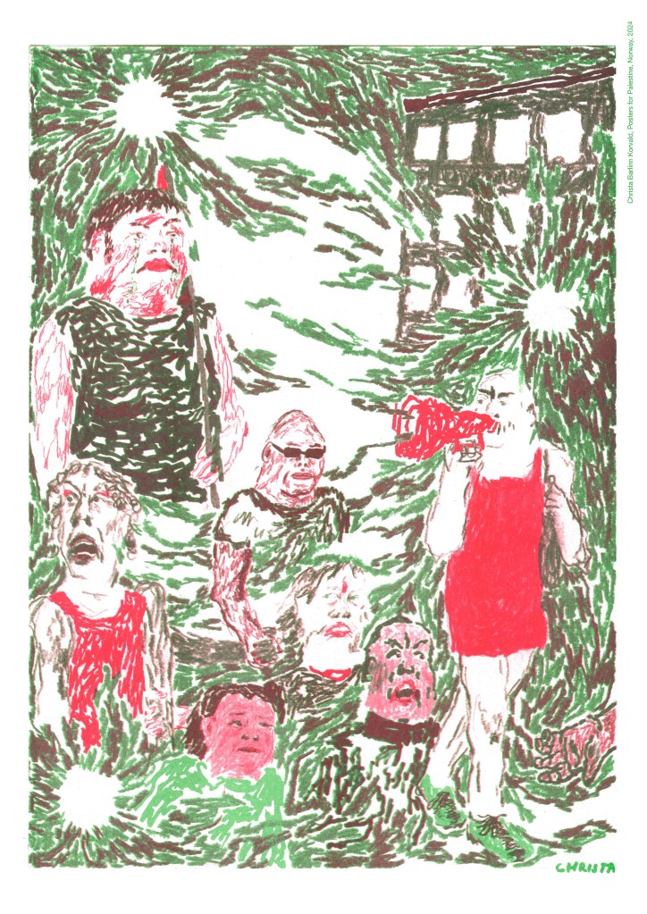 Christa Barlinn Korvald is an artist and illustrator living in Oslo. Focusing on drawing and paper-mâché, Barlinn Korvald works in galleries and theaters as well as streets and demonstrations. In 2022,with a group of three, Barlinn Korvald was awarded the Annual National Art Exhibition’s prize for the film “BBQ & Apocalypse”. “Despite the growing economy we have short arms and demand the forest back” and “Butch Don’t Cry” are the names of Barlinn Korvald’s latest exhibitions.